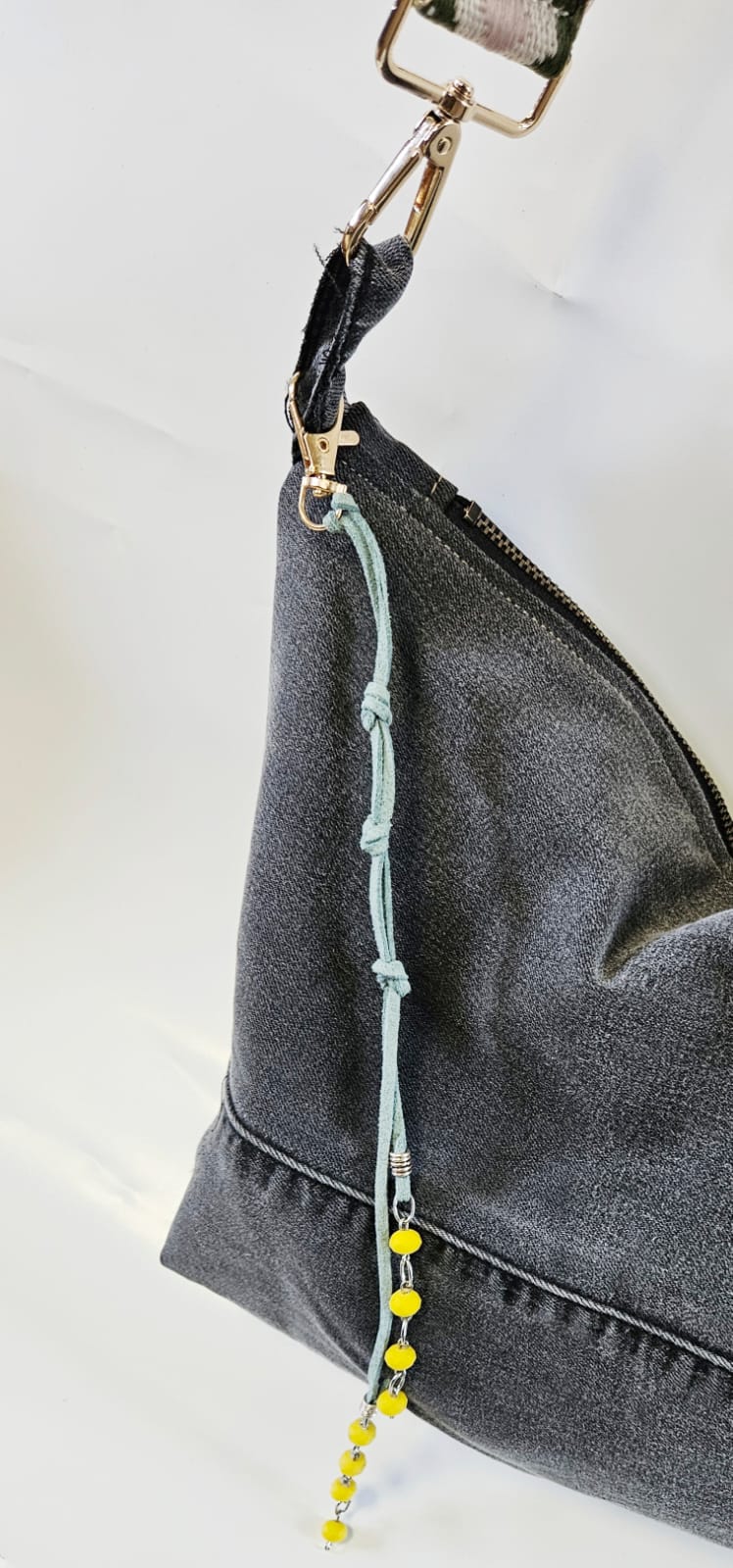 על התיק תלוי תליון מחזיק מפתחות שונה ומיוחד לכל תיק.